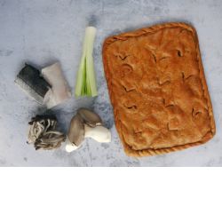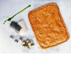EMPANADA DE MERLUZA CON SALSA DE PUERROS Y SETAS
